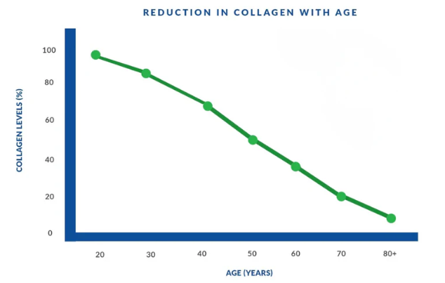 Studies show that skin levels of collagen decrease 11-13% each decade after the age of 30.